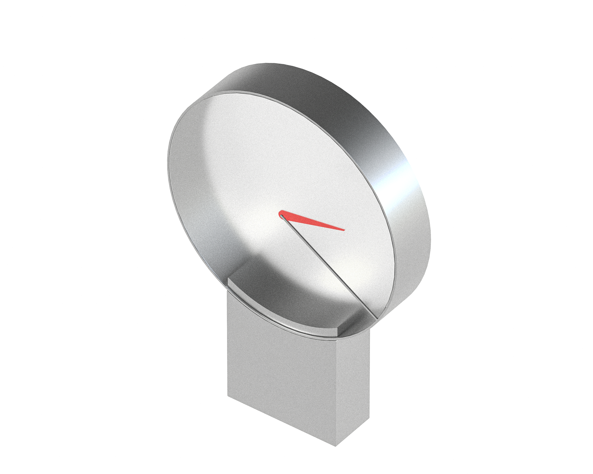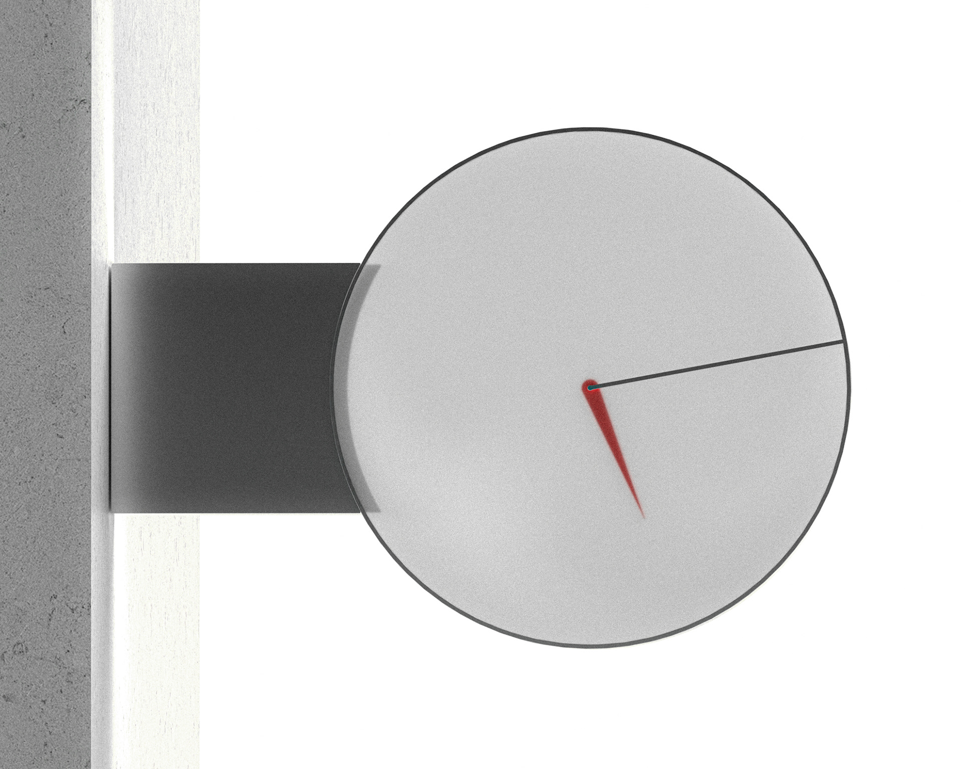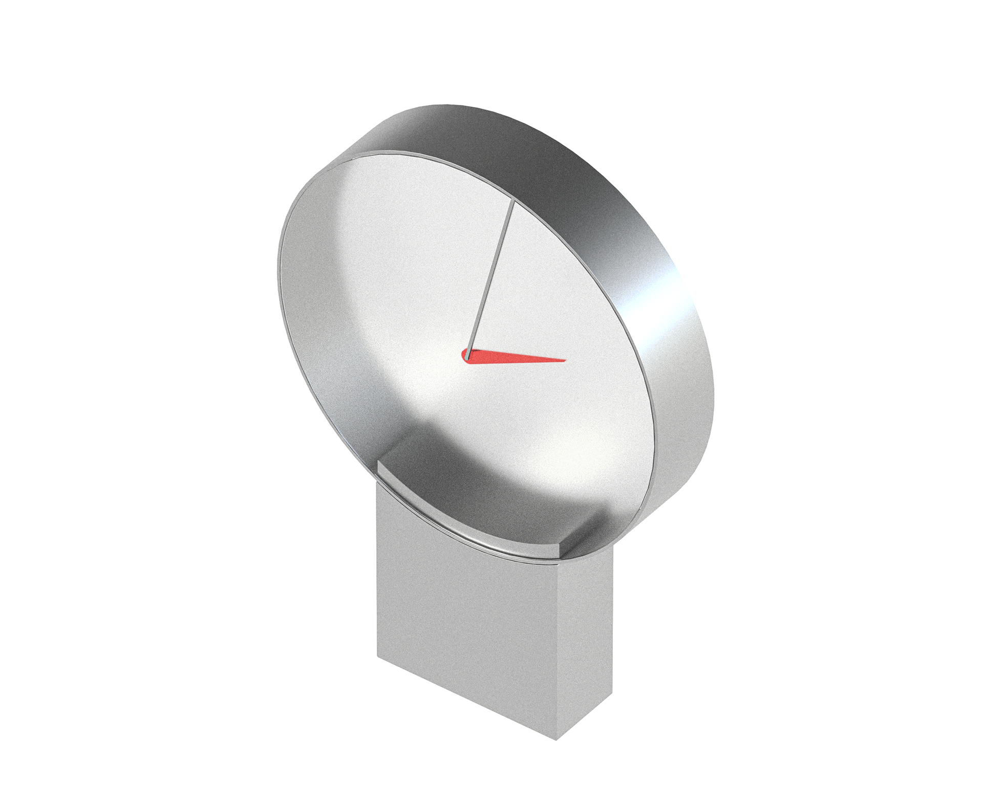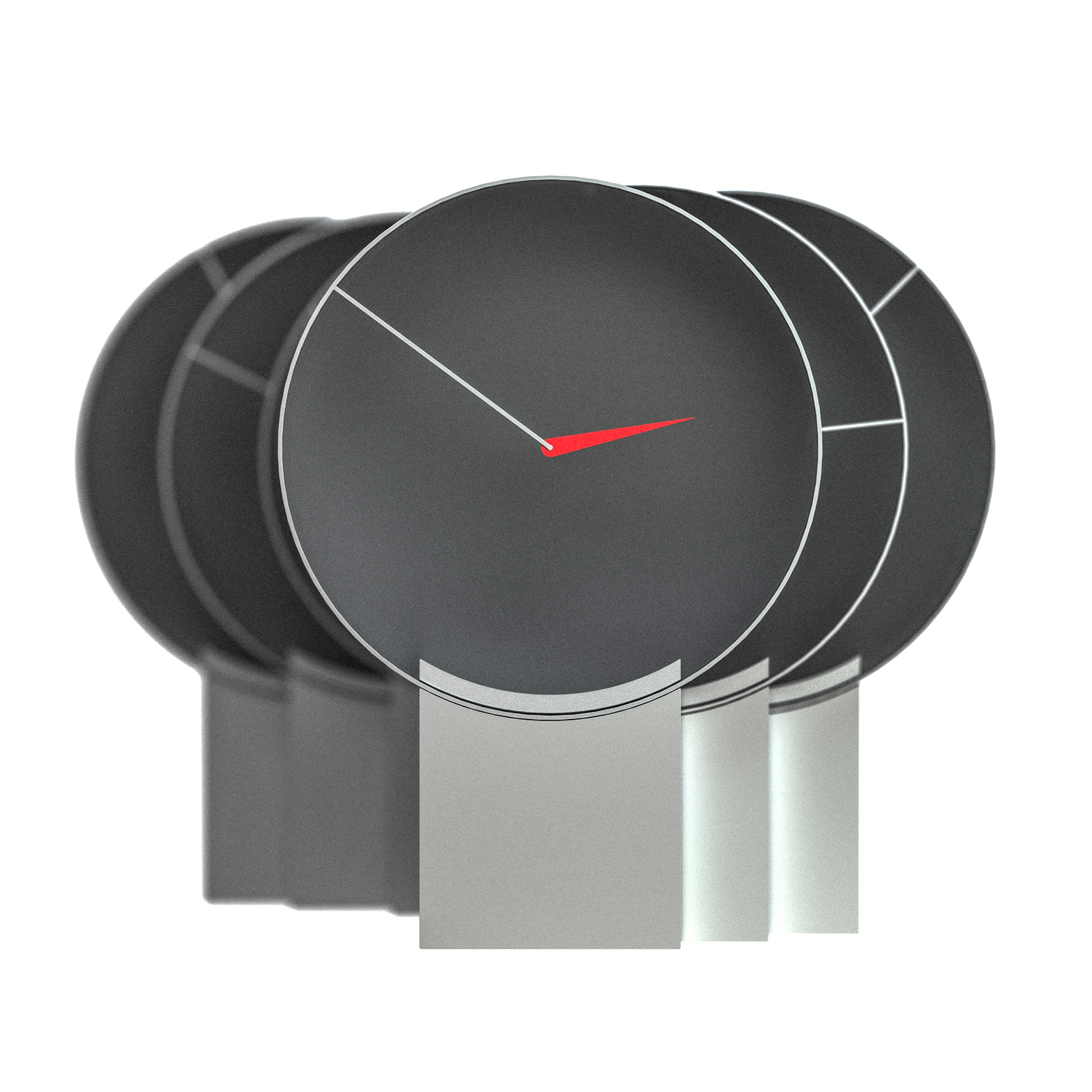 In this clock, time is expressed through the movement of a raw stainless-steel body. A bent sheet of metal that slowly turns to indicate time, while its hollow interior emphasizes the concept of void within a familiar everyday object.